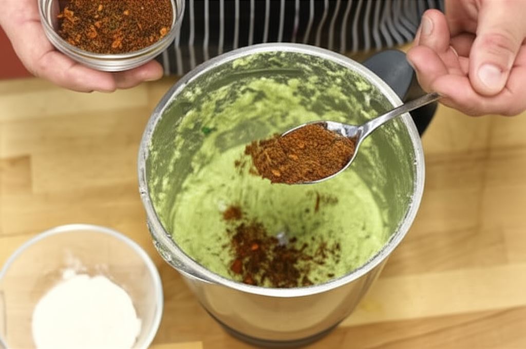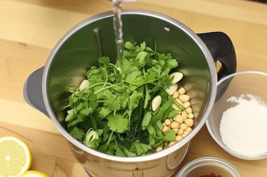 Odcedzoną ciecierzycę, natkę pietruszki i kolendry, chili, posiekaną cebulę, czosnek, szczypior i fragment pora wrzuć do kielicha blendera, zalej wodą gazowaną i zblenduj starannie.