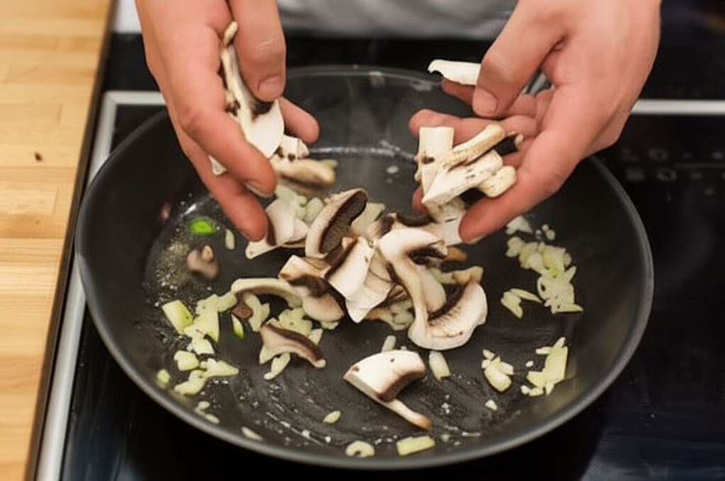 Na patelni zeszklij pokrojoną cebulę na margarynie, potem dodaj plastry pieczarek i smaż do momentu, aż zmiękną.