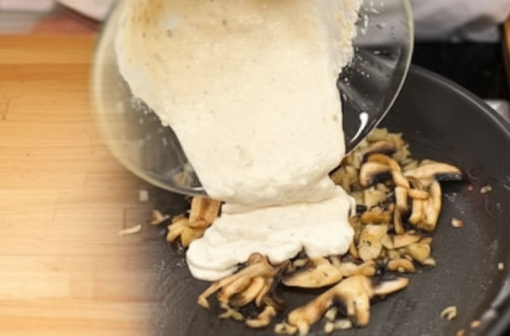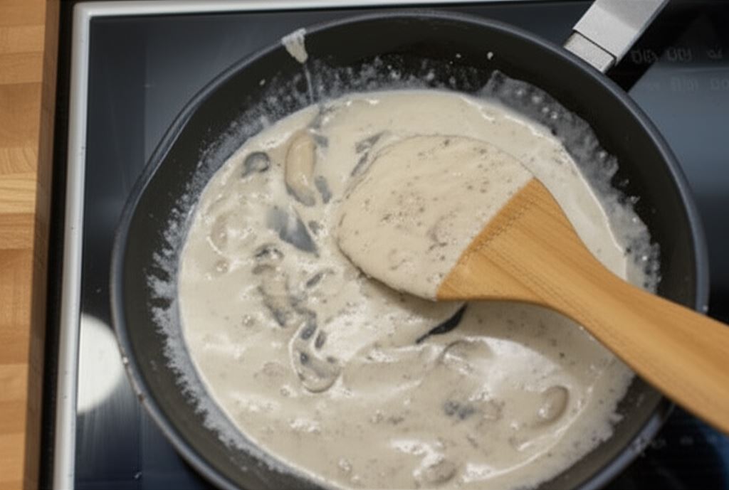 Wymieszaj śmietankę z sosem Knorr i 200 ml wody, następnie przelej na patelnię. Zagotuj całość.