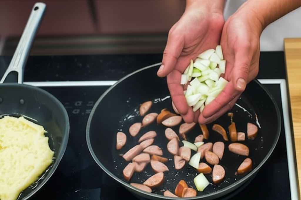Kiełbasę pokrój na pół plastry i obsmaż na patelni. Dodaj pokrojoną w kostkę o boku centymetra cebulę.