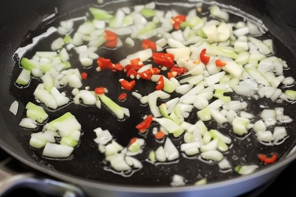 Cebulę, czosnek i chili posiekaj drobno i zrumień na patelni.