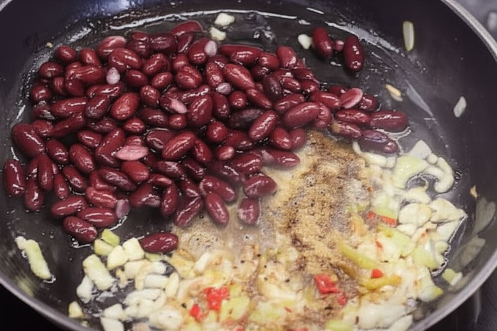 Kiedy składniki staną się porządnie zrumienione, wsyp przyprawy i po krótkiej chwili smażenia dodaj odcedzoną fasolkę.