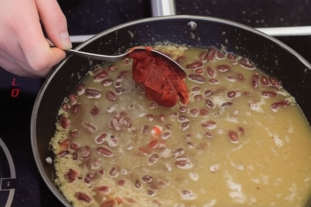 Teraz wlej 0,5 l wody i wsyp koncentrat pomidorowy.