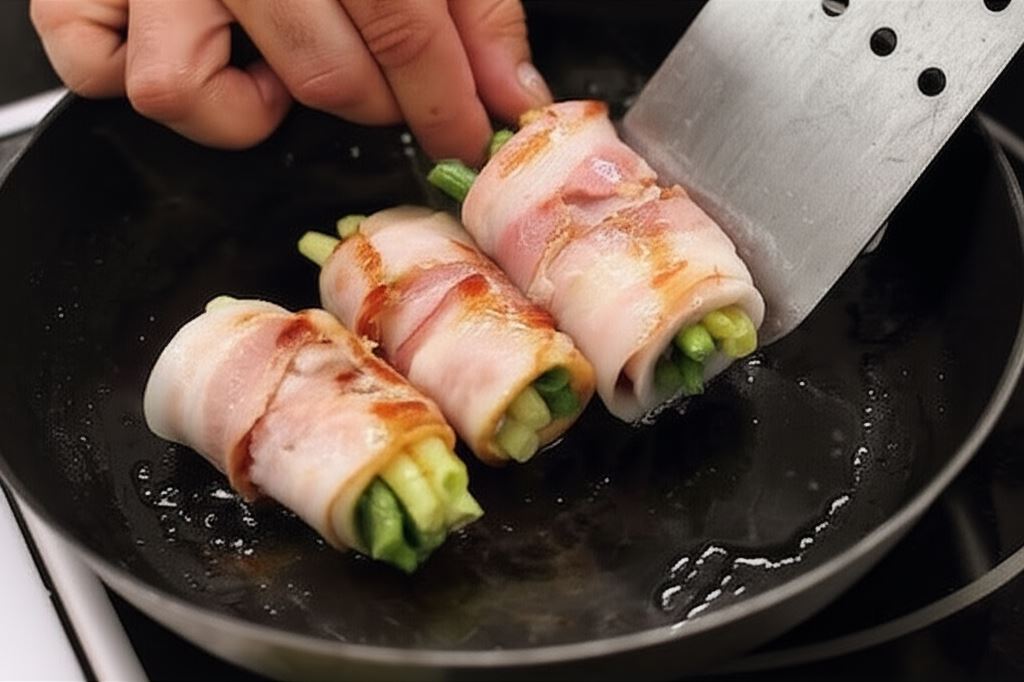 Snopki podsmażaj na gorącym oleju, aby boczek się zrumienił i dobrze połączył całość, potem umieść na 15 minut w piekarniku rozgrzanym do temperatury 120 stopni.