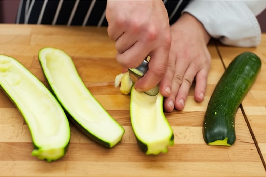 Cukinie opłucz, wysusz i przetnij wzdłuż na połowy. Potem używając łyżki wydrąż z wnętrza nasiona i część miąższu tworząc zagłębienie, w które później umieścisz farsz.