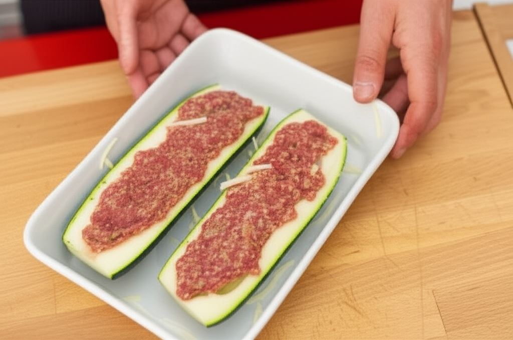 Wypełnij cukinię mięsnym farszem. Nafaszerowane warzywa włóż do naczynia żaroodpornego i obsyp wierzch startym serem żółtym.
