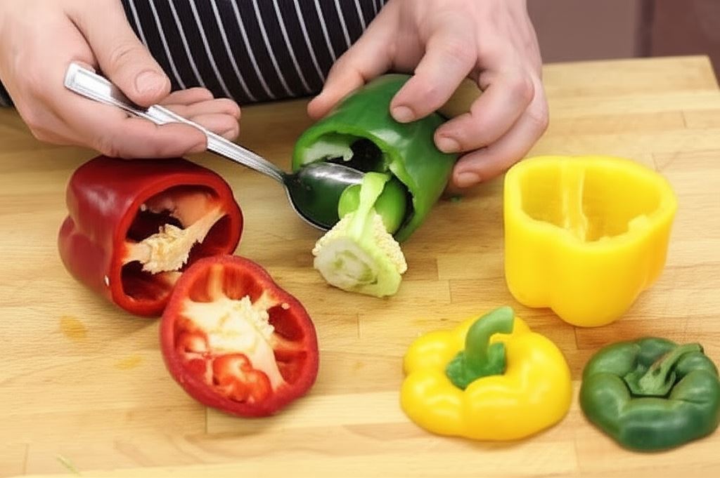 Odetnij górne części papryk. Następnie usuń pestki i białe wewnętrzne fragmenty papryki.