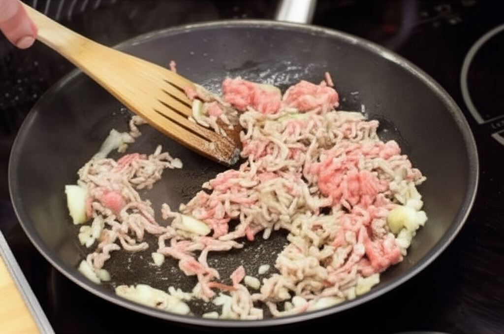 Cebulę i czosnek posiekaj i zrumień na rozgrzanym tłuszczu wraz z mięsem na patelni przez około 8 minut.