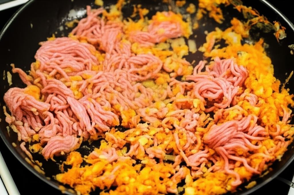 Cebulę posiekaj w małą kostkę i zrumień na oleju wraz z czosnkiem, wsyp drobno utartą marchewkę i wymieszaj z mięsem mielonym.
