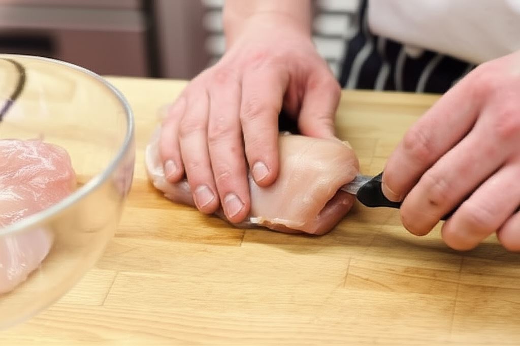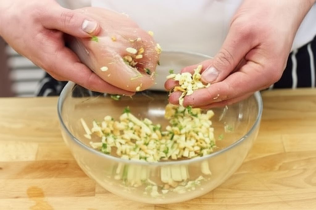 Każdą pierś natnij wzdłuż tak, by utworzyła się kieszonka. Posiekaj kolendrę.
