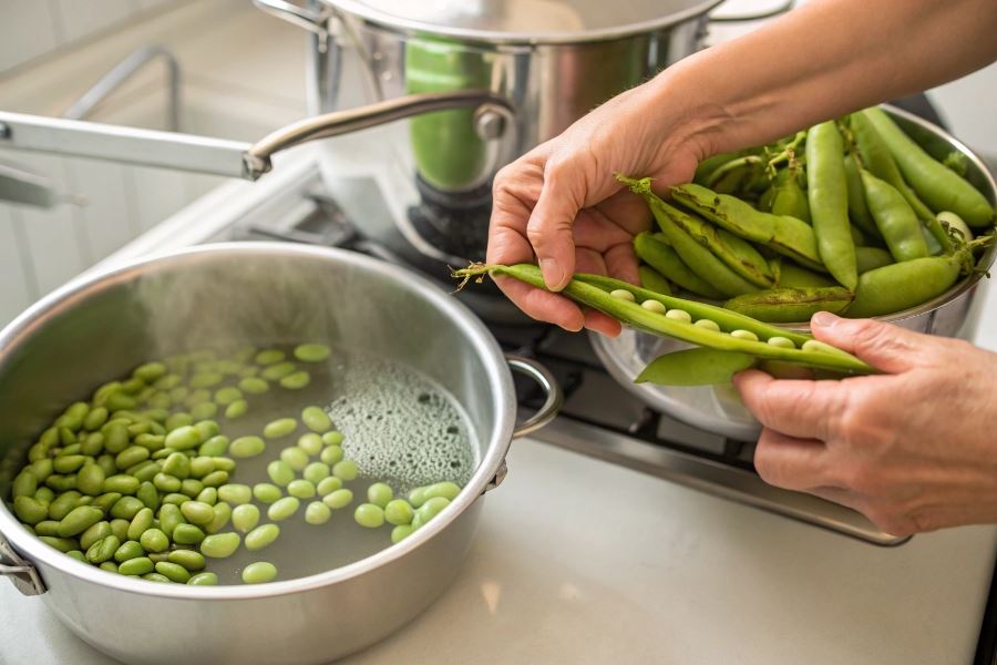 Po wyłuskaniu ziarna wymagają dokładnego płukania pod zimną, bieżącą wodą. Usuń wszelkie pozostałości łupin i zanieczyszczenia. Dla najlepszych rezultatów przepłucz bób kilkakrotnie, delikatnie przesiewając ziarna palcami.