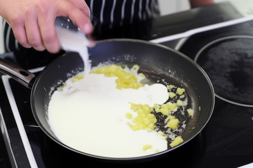 W tym czasie roztop na patelni masło, zrumień na nim posiekaną w małą kostkę cebulę i wsyp łyżkę mąki. Do uzyskanej zasmażki wlej zimną śmietanę i mleko. Wszystko zagotuj i przypraw do smaku kostką Knorr oraz szczyptą startej gałki muszkatołowej i pieprzem. Sos do Fettuccine Alfredo gotuj przez minutę, aż stanie się gęsty.