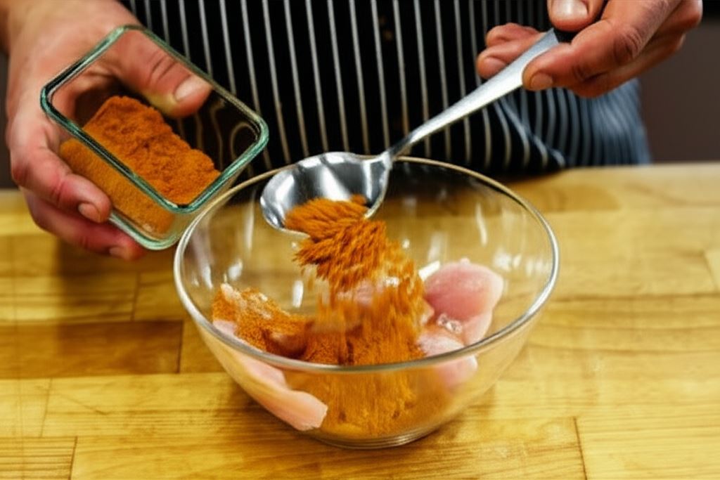Filety z kurczaka opłucz, wysusz, potnij ukośnie na niewielkie kotleciki. Mięso włóż do miski, wlej oliwę i wsyp Przyprawę do złocistego kurczaka Knorr. Przyprawa spowoduje, że mięso stanie się delikatne, z lekko korzenno-orzechowym aromatem.