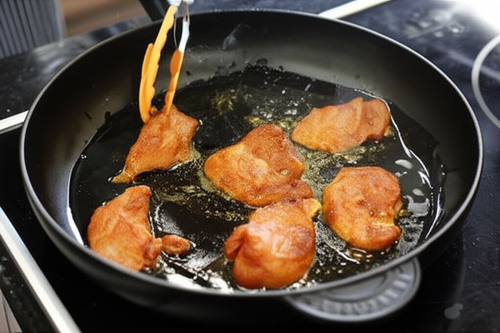 Kawałki kurczaka podsmażaj delikatnie po obu stronach na nagrzanej patelni, odłóż na bok.