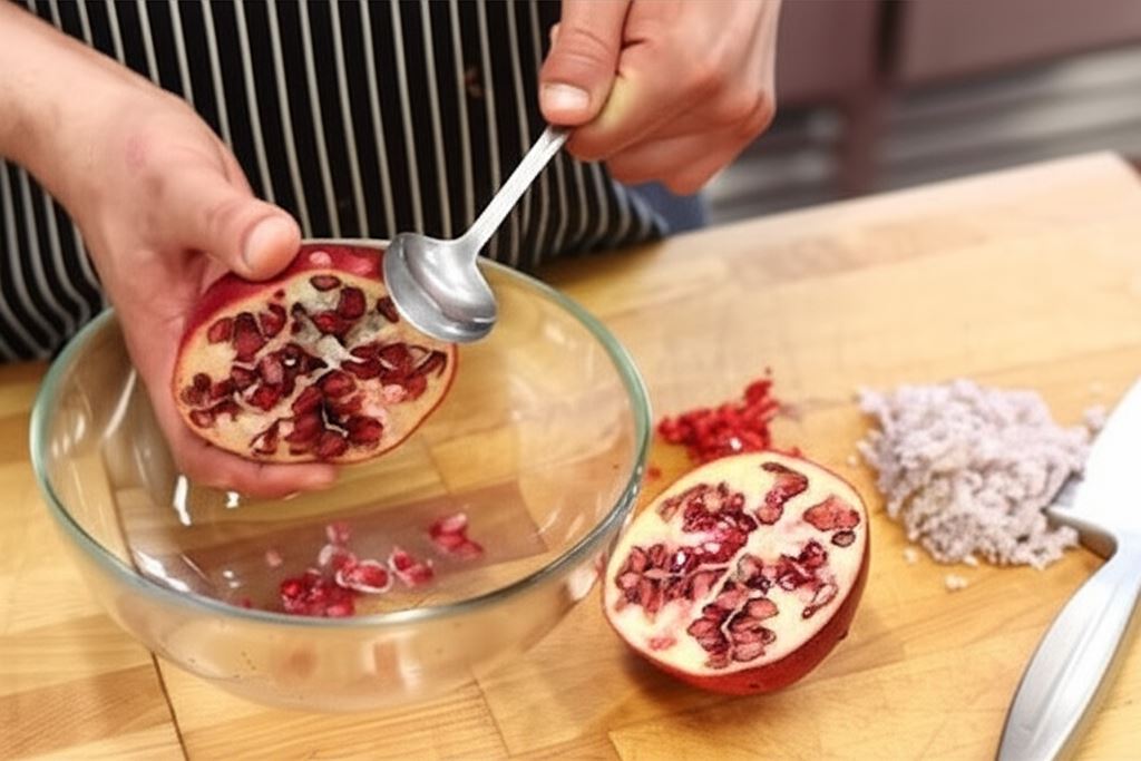 Szalotkę obierz, posiekaj w małą kosteczkę. Papryczkę chilli przetnij na połowę, wyciągnij nasiona, posiekaj w małą kosteczkę. Owoc granatu potocz po stole i przetnij na pół. Uderzając w niego łyżką lub rączką noża spowoduj, aby wszystkie nasiona owocu wypadły do miski.