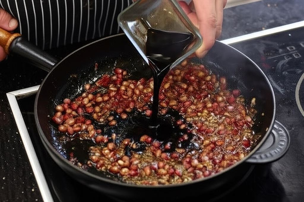 Na tej samej patelni, gdzie smażyłeś kurczaka, zrumień chilli i szalotkę. Kiedy cebula stanie się szklista, wsyp pestki granatu i cukier. Smażąc składniki razem, poczekaj aż cukier skarmelizuje się. Następnie wlej ocet balsamiczny. Gotuj całość około 5 minut, dopóki ocet nie wyparuje i nie zredukuje swojej objętości o ¾.