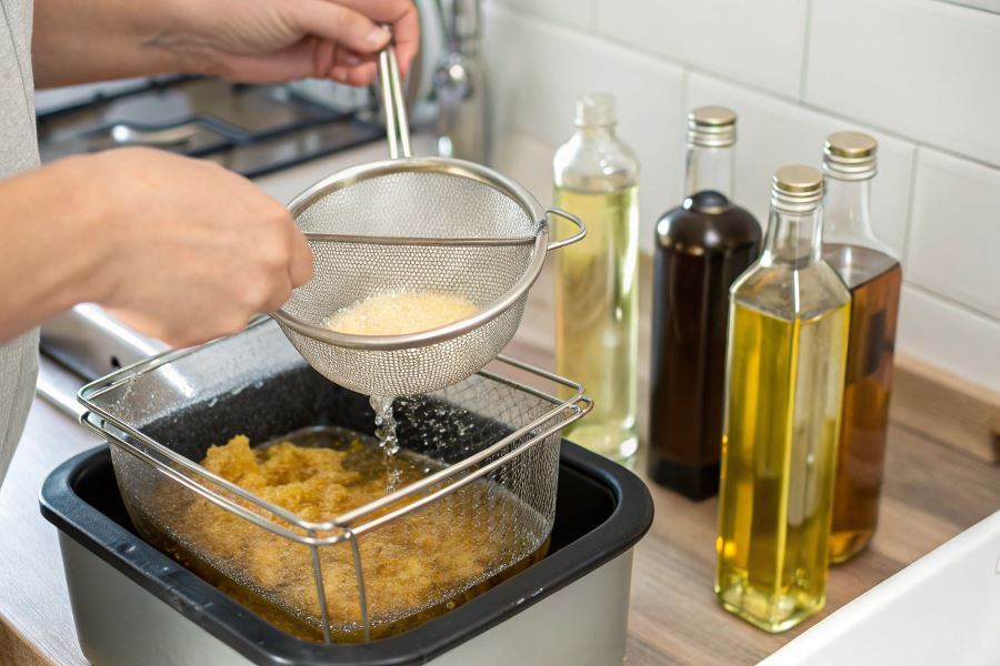 Unikaj przechowywania oleju w plastikowych pojemnikach, ponieważ mogą one wchodzić w reakcje chemiczne z tłuszczem, zwłaszcza gdy olej jest jeszcze ciepły. Pojemniki z filtrem wbudowanym w nakrętkę stanowią praktyczne rozwiązanie dla osób regularnie filtrujących olej, umożliwiając dodatkowe oczyszczenie podczas przelewania.