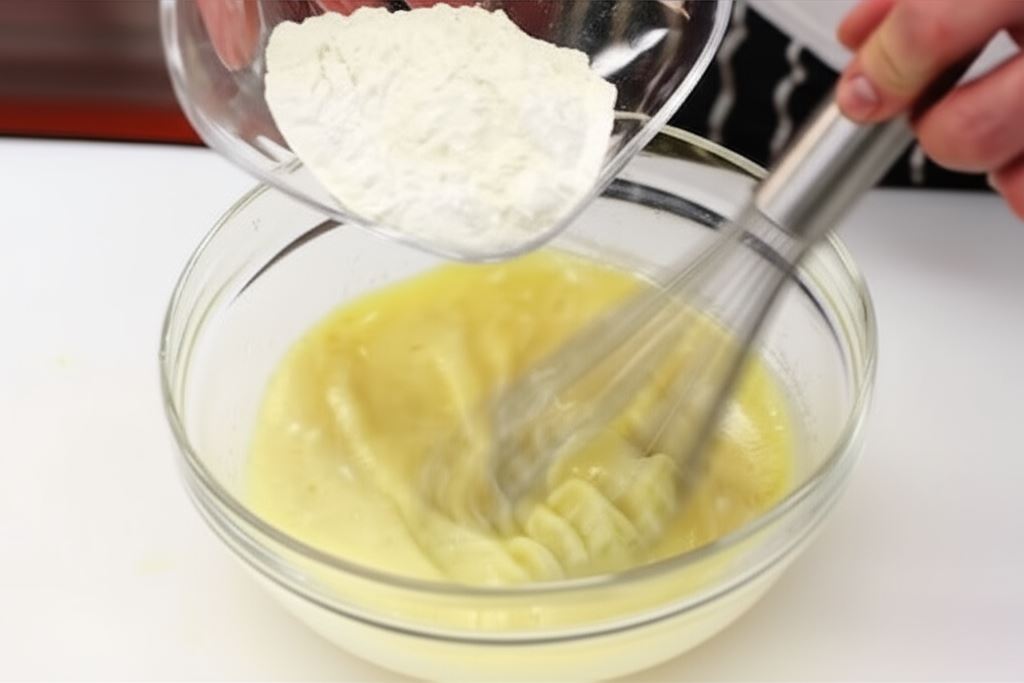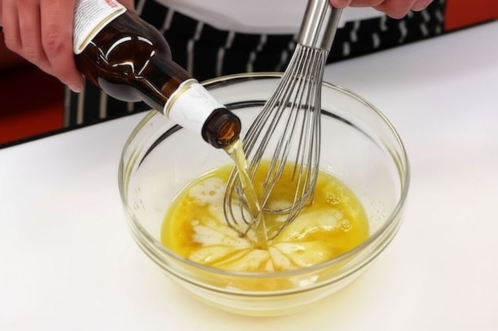 Potem wbij jajka i wlej piwo. Całość starannie wymieszaj.