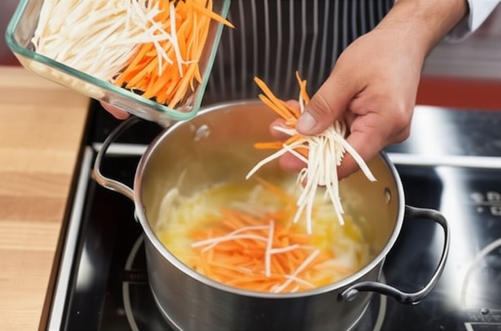 W garnku o szerokim dnie na roztopionym maśle lekko zrumień pokrojone w cienkie paski warzywa. Wsyp słodką i ostrą paprykę oraz imbir, smaż moment, a następnie dodaj mąkę. Wszystko starannie wymieszaj.