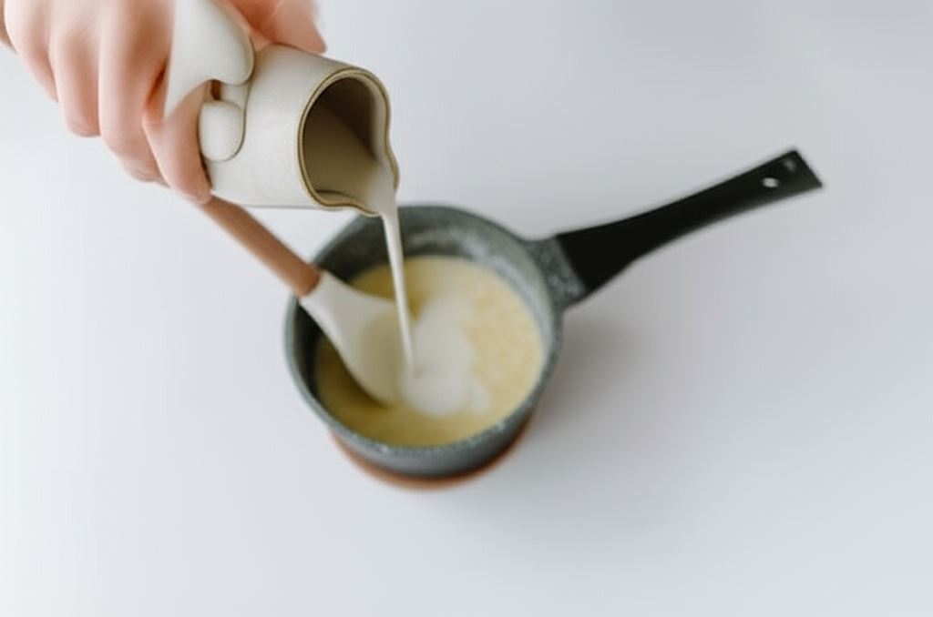 Do rondelka wkładamy masło z cukrem. Ogrzewamy aż składniki się rozpuszczą. Odstawiamy z palnika, dodajemy kremówkę i starannie mieszamy. Odstawiamy do ostygnięcia.
