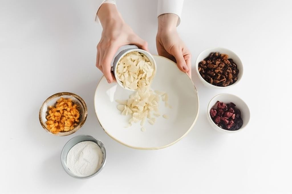 Do miski wsypujemy płatki migdałowe, rodzynki, skórkę pomarańczową i mąkę pszenną. Wszystko mieszamy.