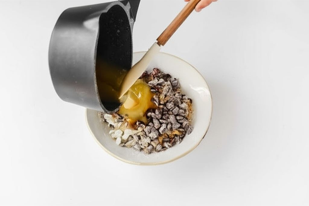 Do suszonych owoców dodajemy ostudzoną mieszankę z cukrem. Mieszamy aż składniki się połączą.