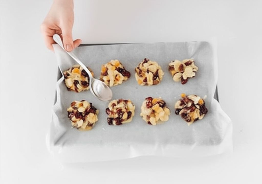Blachę wykładamy papierem do pieczenia. Formujemy przy użyciu łyżki ciastka i umieszczamy je w dużych odstępach od siebie. Spłaszczamy łyżką. (Ciastka się nieznacznie rozpłyną) Pieczemy ciastka w temperaturze 160 C przez około 13-15 min, aż uzyskają złoty kolor. Wyjmujemy z piekarnika i za pomocą metalowej foremki wycinamy idealne koła.