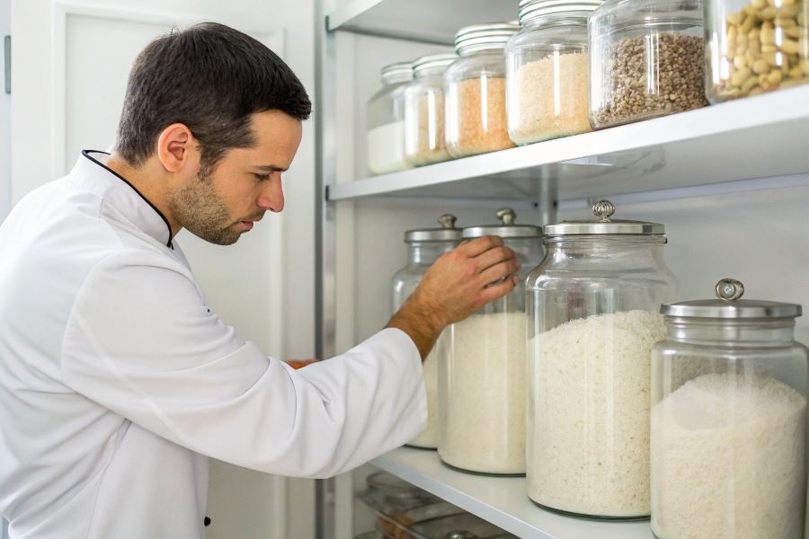 Spiżarnia lub szafka kuchenna powinna spełniać kilka warunków: temperatura poniżej 20°C, brak bezpośredniego nasłonecznienia, niska wilgotność powietrza. Warto umieścić w niej higrometr, aby monitorować poziom wilgotności – optymalny zakres to 50-60%.