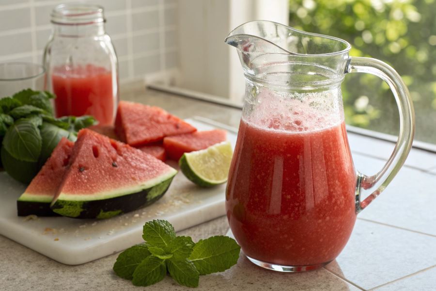 Podstawowa proporcja to około 1 kg czystego miąższu arbuza na 2-3 osoby. Jeśli dodajesz limonkę, zacznij od 1 łyżki soku i dostosuj ilość do własnych preferencji. Miętę najlepiej dodawać stopniowo – 5-6 listków na szklankę soku to dobry początek.