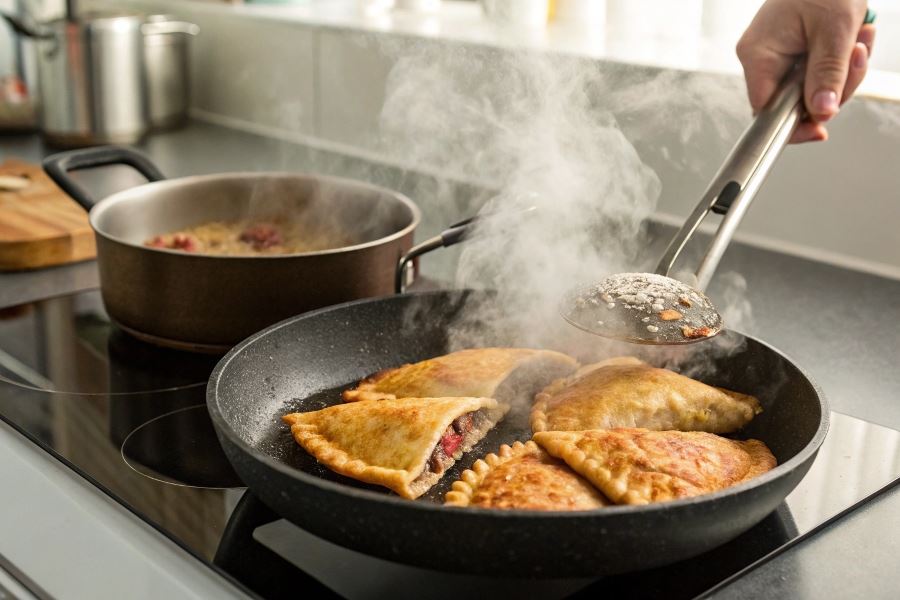 - Umieść mrożone czebureki na patelni, nie układając ich zbyt blisko siebie