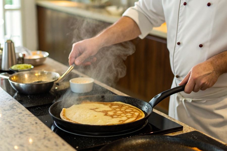 Wskazówka eksperta: Aby uzyskać równomiernie ogrzane naleśniki, przykryj patelnię pokrywką na pierwszą minutę smażenia – pomoże to rozprowadzić ciepło również do wnętrza naleśnika.