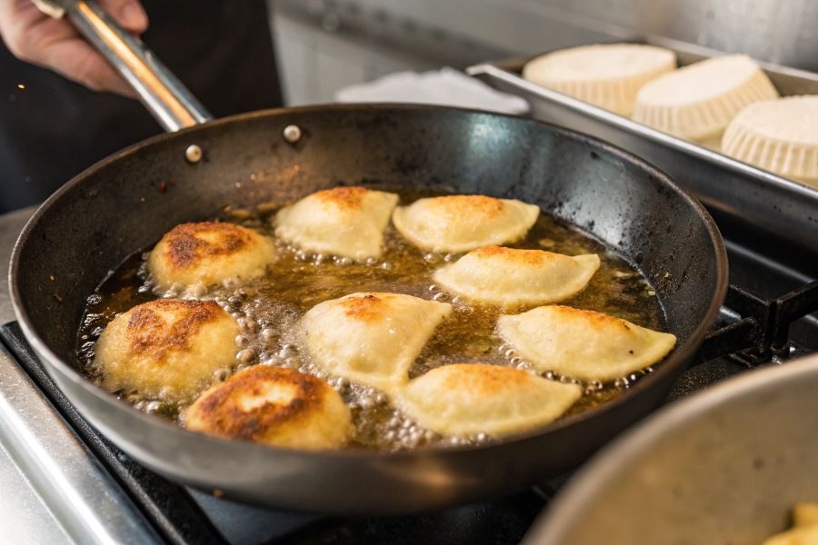 Smażenie głębokie – uszka są całkowicie zanurzone w tłuszczu, co zapewnia równomierne zrumienienie ze wszystkich stron. Ta metoda wymaga więcej tłuszczu, ale daje najbardziej chrupiący efekt. Idealny czas smażenia to 3-4 minuty do uzyskania złotobrązowego koloru.