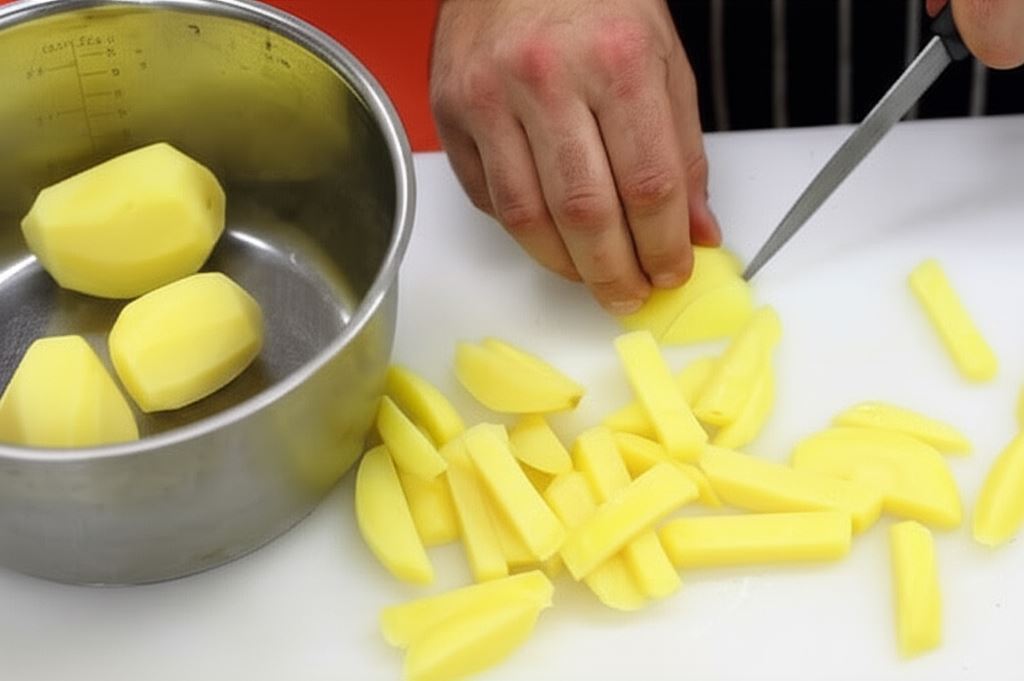 Ziemniaki obierz, opłucz i ugotuj do półmiękka. Kiedy będą ugotowane, wyciągnij je z wody, przestudź, a potem pokrój w słupki o szerokości około 1 cm.