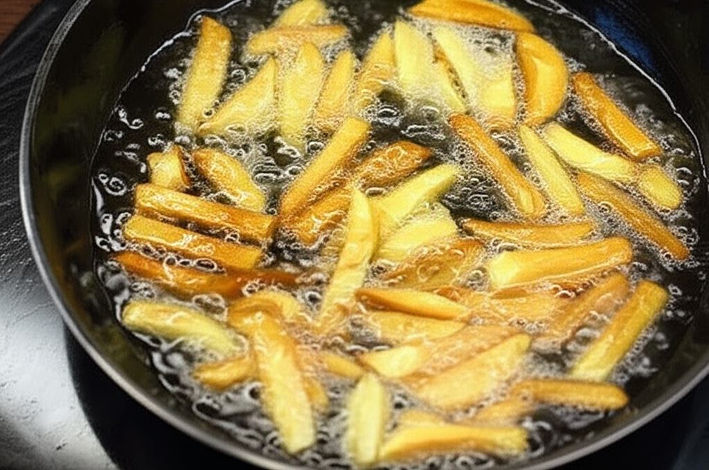 Wlej olej roślinny na patelnię. Kiedy tłuszcz będzie bardzo gorący, ostrożnie umieść frytki i smaż aż uzyskają złoty kolor. Usmażone ziemniaki wyjmij przy użyciu sitka, przenieś na papierowy ręcznik kuchenny i zostaw na moment, aby odciekł nadmiar tłuszczu.