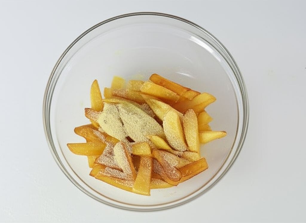 Tak przyrządzone frytki wsyp do miski, posyp granulowanym czosnkiem i zamieszaj, delikatnie podrzucając.