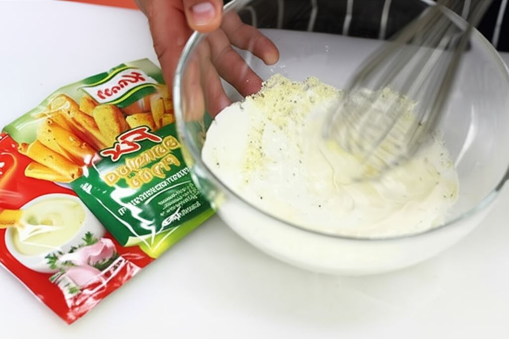 W małej miseczce wymieszaj razem Majonez Babuni Hellmann's i śmietanę. Do uzyskanego dipu wsyp sos sałatkowy Knorr i połącz na jednolitą, gładką masę. Świeżo upieczone i nadal gorące frytki umieść na talerzu. Serwuj z miseczką napełnioną sosem śmietanowo-majonezowym.