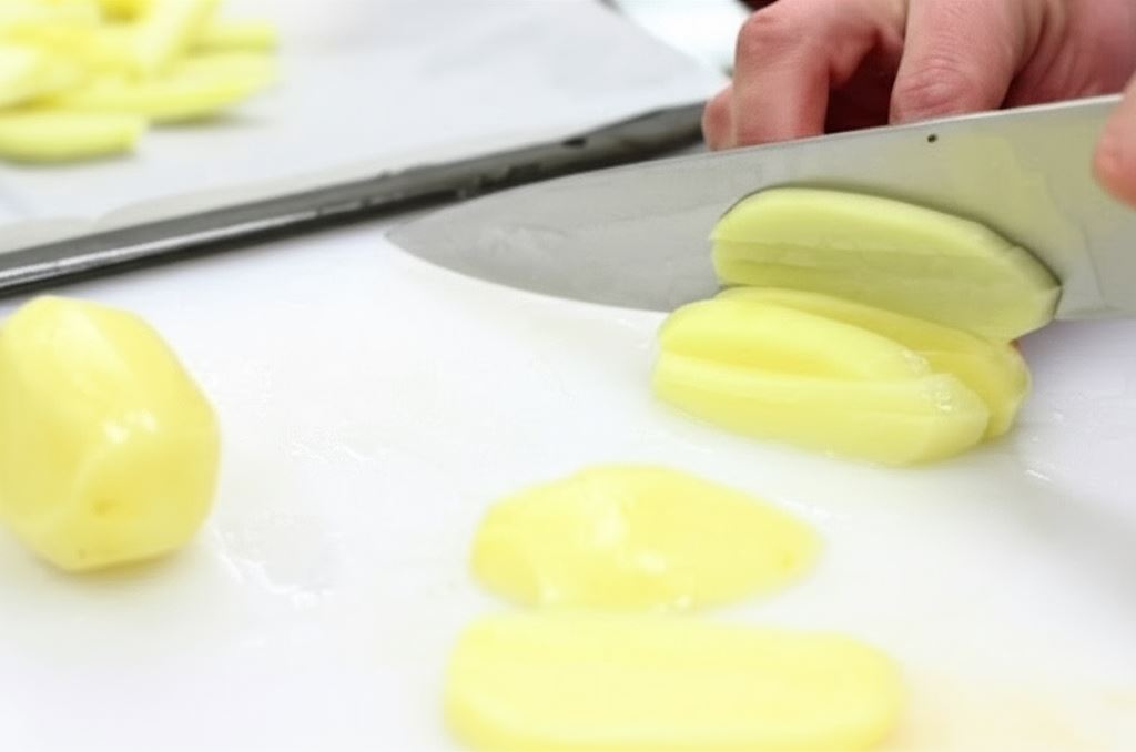 Obierz ziemniaki i pokrój je na plastry o grubości 0,5 cm, po czym przekrój na słupki, aby uzyskać tradycyjne frytki.