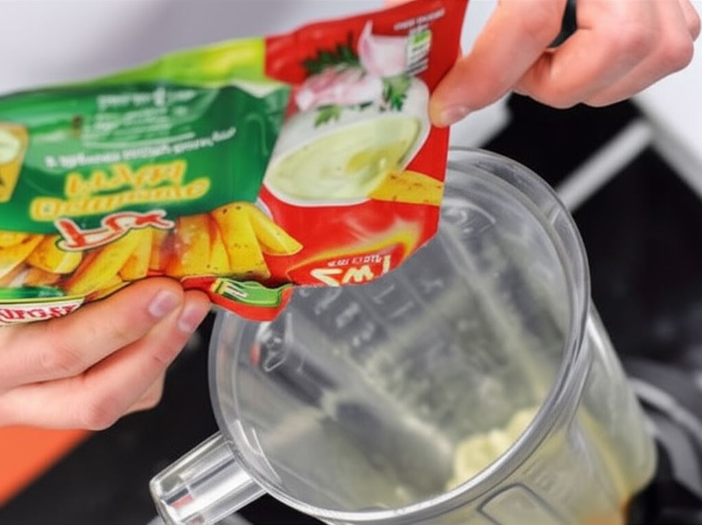 W międzyczasie przygotuj tradycyjny sos Aioli. Do naczynia miksera dodaj żółtka, ząbki czosnku oraz Dip Czosnkowy z opakowania Fix Knorr.