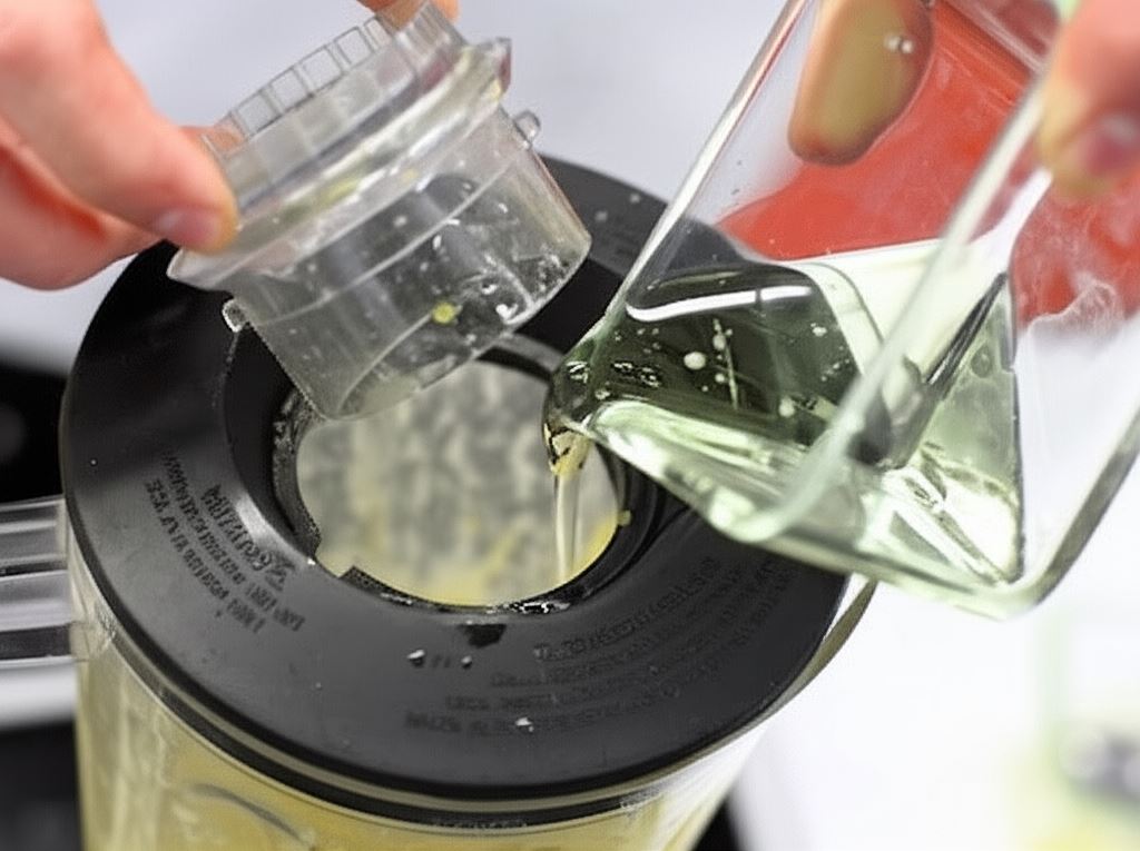 Rozpocznij miksowanie i jednocześnie wlewaj cienką strużką olej, aby uzyskać sos o konsystencji zbliżonej do majonezu.