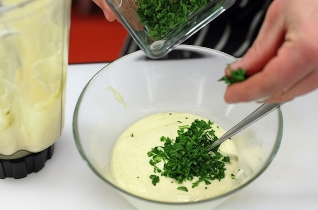 Na koniec wsyp do sosu drobno posiekaną natkę pietruszki. Upieczone i chrupiące frytki serwuj z sosem Aioli osobno.