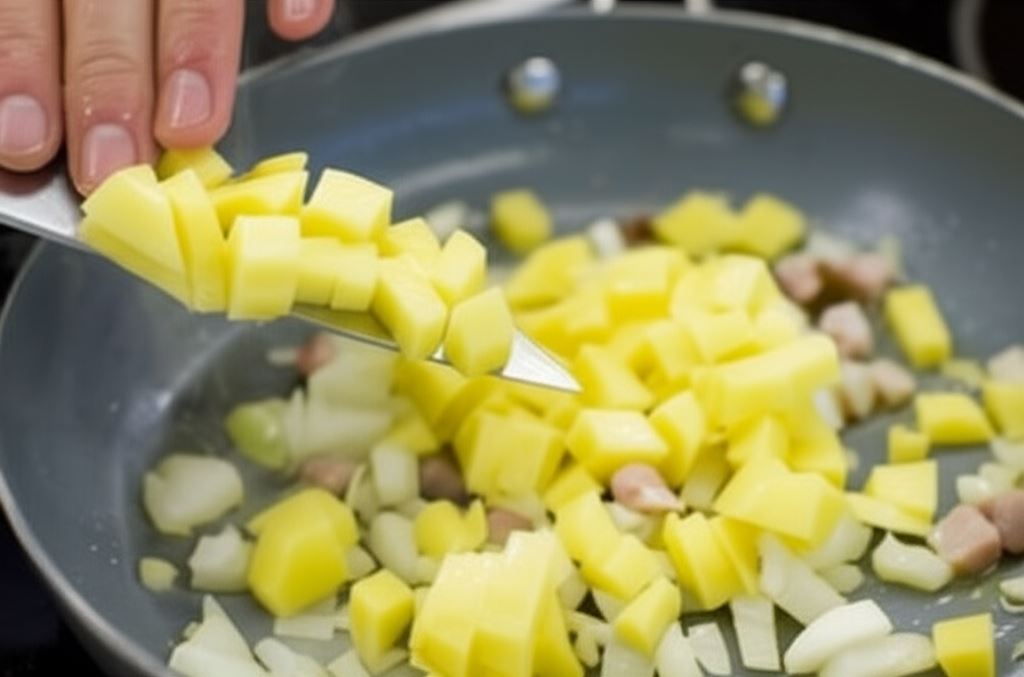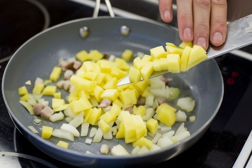 Obierz ziemniaki i cebulę, pokrój w kostkę i wsyp do boczku. Smaż na małym ogniu przez około 10 minut.