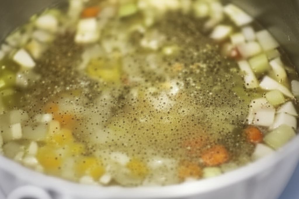 W międzyczasie obierz pozostałe warzywa i pokrój na kawałki. Dodaj do wysokiego garnka wraz ze składnikami z patelni i zalej bulionem.
