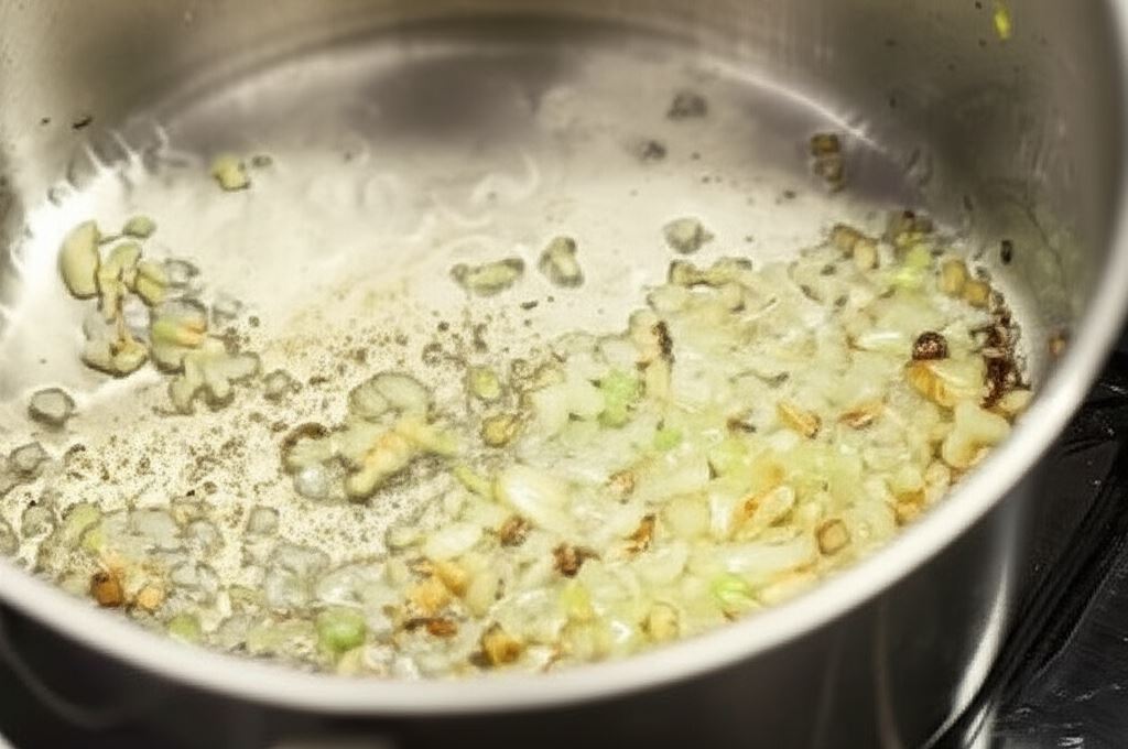 W garnku podgrzej oliwę i podsmaż cebulę oraz czosnek.