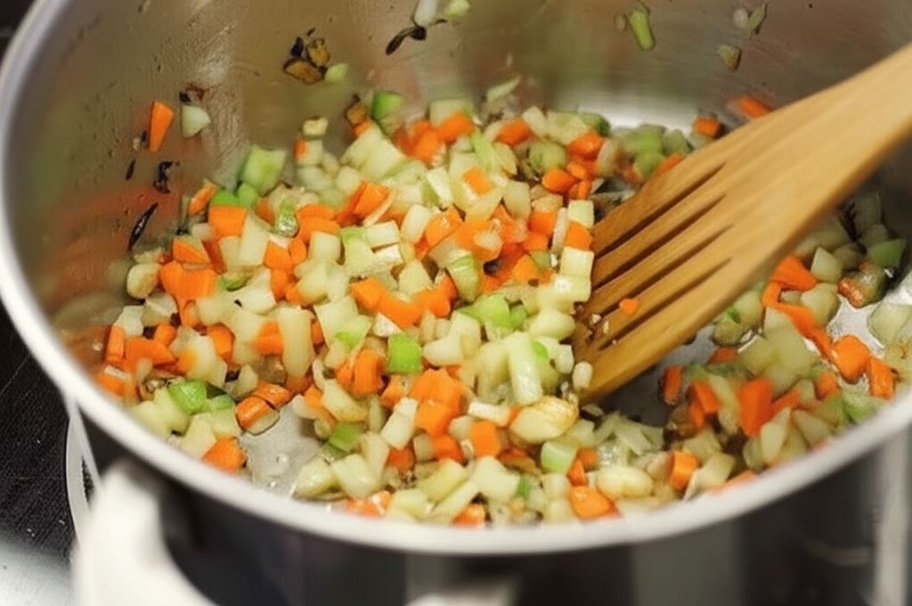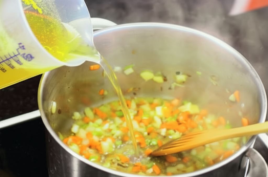 Po paru minutach smażenia dodaj bulion i wszystko doprowadź do wrzenia.