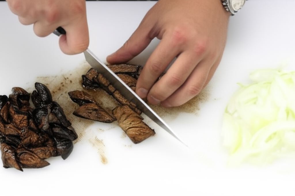 Oczyść i opłucz grzyby oraz cebule. Grzyby potnij na kawałki o wielkości około 2 cm, a cebule pokrój w piórka.