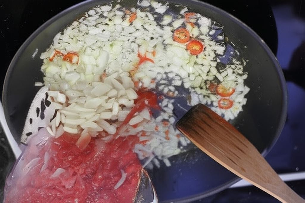 Na oliwie zrumień posiekaną w małą kostkę cebulę, czosnek i papryczkę chili. Potem dodaj rozdrobnione pomidory, pół szklanki wody oraz wsyp Fix Spaghetti Napoli Knorr.