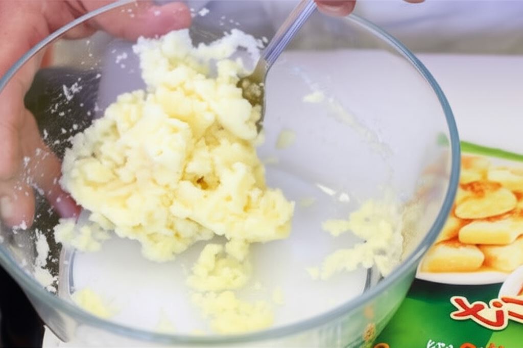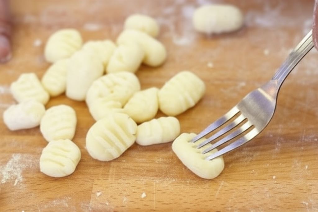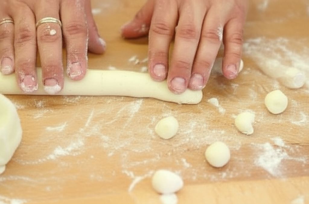 Ciasto w formie wałka podziel na małe kwadraty. Z każdego kwadratu uformuj następnie kulkę. Przy pomocy widelca spłaszcz kulkę tak, by na kluskach powstał charakterystyczny wzorek.