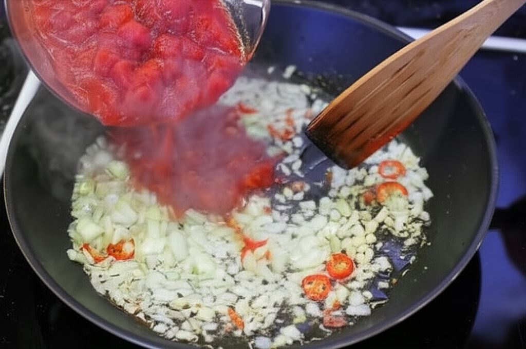 Na oliwie zrumień posiekaną w małą kostkę cebulę, czosnek i papryczkę chili. Potem dodaj rozdrobnione pomidory i gotuj sos przez około 15 minut, aż stanie się gęstszy. Przypraw go solą, pieprzem oraz cukrem.