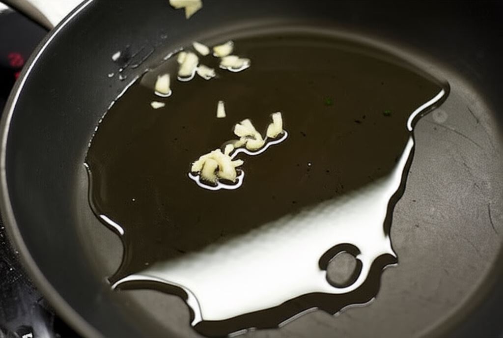 W międzyczasie na patelni z oliwą zrumień posiekany czosnek.