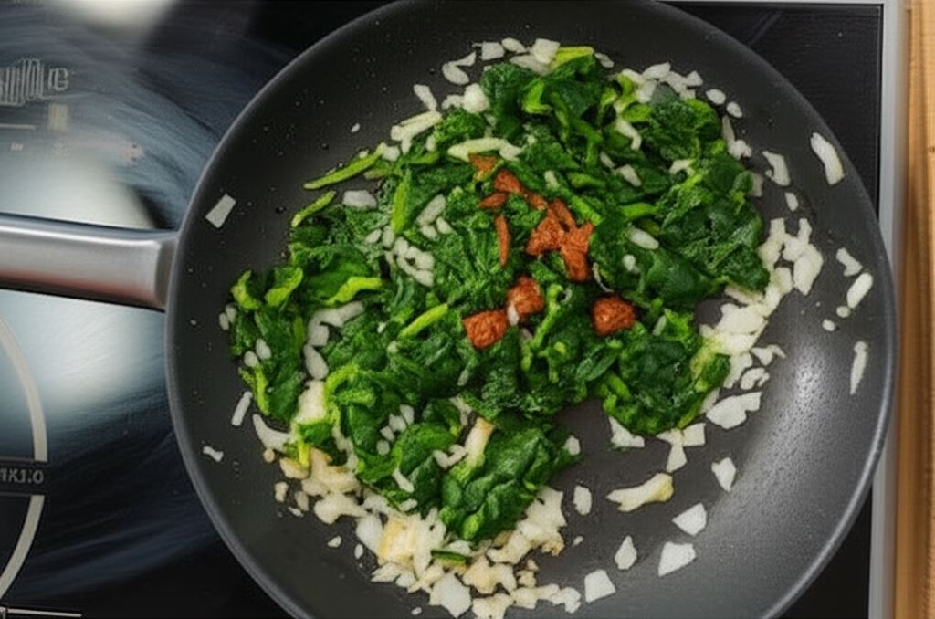 Na rozgrzanym tłuszczu zrumień pokrojoną w kostkę cebulę, wsyp rozmrożony i odciśnięty szpinak oraz suszone pomidory pokrojone w kostkę.